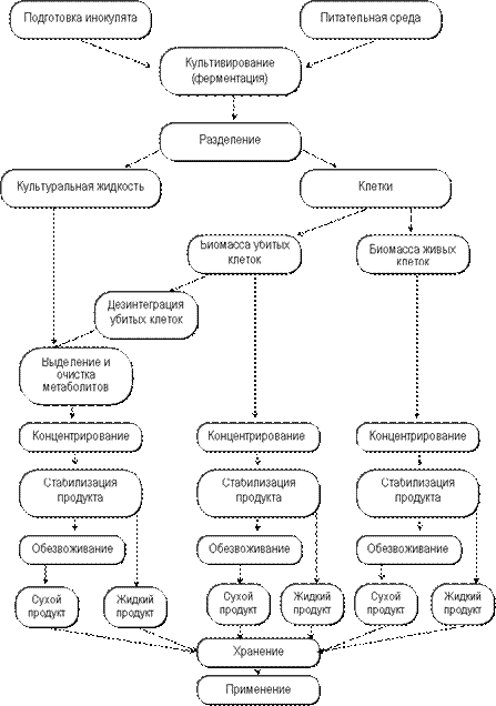 Большое разнообразие биотехнологических процессов, нашедших промышленное применение, приводит к необходимости рассмотреть общие, наиболее важные проблемы, возникающие при создании любого биотехнологического производства. Процессы промышленной биотехнологии разделяют на 2 большие группы: производство биомассы и получение продуктов метаболизма. Однако такая классификация не отражает наиболее существенных с технологической точки зрения аспектов промышленных биотехнологических процессов. В этом плане необходимо рассматривать стадии биотехнологического производства, их сходство и различие в зависимости от конечной цели биотехнологического процесса. В общем виде система биотехнологического производства продуктов микробного синтеза представлена на рис. 1.