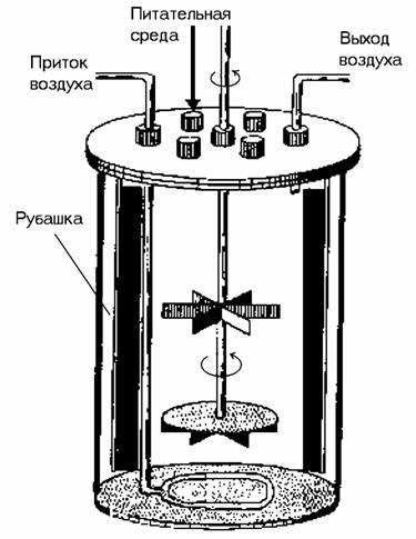 Ферментация проходит в специальных емкостях, называемых ферментерами или биореакторами. Конструкция биореактора приведена на рис. 3. Основными элементами ферментера являются двойные стенки, промежуток между которыми заполняется охлаждающей или нагревающей жидкостью, входные отверстия для газовых и жидких потоков, система контроля за составом питательной среды и условиями внутри реактора.