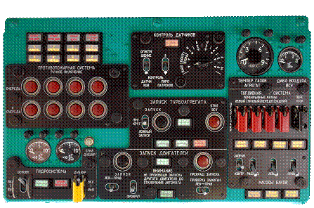 Включатель КОНТРОЛЬ ПРИРОПАТРОНОВ на щитке КОНТРОЛЬ ДАТЧИКОВ поочередно установить в положение 1 (первая группа пиропатронов), затем в положение 2 (вторая группа пиропатронов). При всех исправных пиропатронах выключатель ни одно желтое табло 1 ОЧЕРЕДЬ, 2 ОЧЕРЕДЬ гореть не должны.