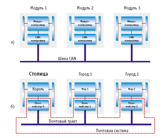 (CAN-шина) и проходит через почтмейстеров (CAN-контроллеры).