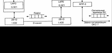 Тем не менее, некоторые пояснения в отношении сходства концепций и различий в терминах DSS-1 и ОКС-7 представляются полезными. На рис. 3.1 показаны АТС ISDN, звено сигнализации ОКС-7, оборудование пользователя ISDN и D-канал в интерфейсе «пользовательсеть». Функции D-канала сходны с функциями звена сигнализации ОКС- 7. Информационные блоки в D-канале, называемые кадрами, аналогичны сигнальным единицам (SU) в системе ОКС-7. Читателям, которые доберутся до главы 5 (QSIG) и глав 6-8 (V5), будет полезно вспомнить этот рисунок.