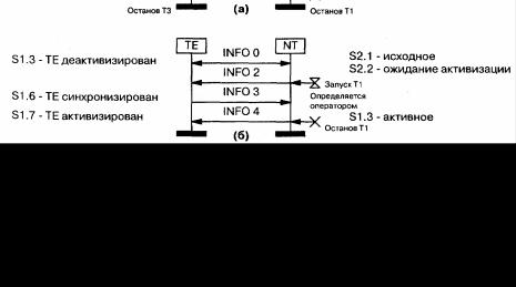 Рис. 3.2. Последовательность сигналов при активизации S- интерфейса: (а) — активизация от ТЕ;