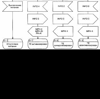 При включении питания ТЕ переходит в исходное состояние S 1.2, когда он готов принимать сигналы. Если питание выключается, ТЕ возвращается в состояние S1.1. Если во время включения питания NT активен и ТЕ обнаруживает сигнал INFO 2 или INFO 4, то процесс переходит в состояние S1.6 или в состояние S1.7, соответственно. Если NT неактивен, что связано с присутствием INFO 0, то процесс переходит в состояние S1.3.