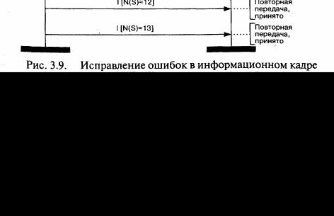 Рассмотрим передачу информационных кадров от терминала к сети (рис. 3.9). Все поступающие к сети кадры проверяются на наличие ошибок, а затем в свободных от ошибок информационных кадрах проверяется порядковый номер. Если величина N(S) выше (по модулю 128) на единицу, чем N(S) последнего принятого информационного кадра, новый кадр считается следующим по порядку и потому принимается, а его информационное поле пересылается конкретной функции сетевого уровня. После этого сеть подтверждает прием информационного кадра своим исходящим кадром с номером приема [N(R)], значение которого на единицу больше (по модулю 128), чем значение N(S) в последнем принятом информационном кадре.