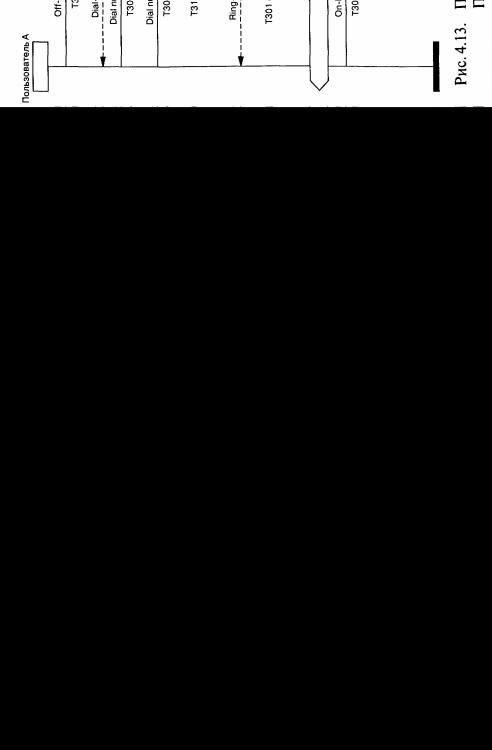 щении SETUP, какой В-канал он предпочитает использовать. Определив, что сеть может поддержать запрашиваемое соединение, исходящая АТС возвращает ТЕ-А сообщение SETUP_ACK-NOWLEDGE, содержащее идентификацию В-канала, который будет использоваться в соединении. Сообщение SETUP_ACK-NOWLEDGE указывает также на необходимость дальнейшей информации для установления соединения в сети, в первую очередь — информации о номере вызываемого пользователя ТЕ-Б. Прием SETU P_AC KNOWLEDGE инициирует посылку вызывающему пользователю акустического сигнала «Ответ станции», который может генерироваться либо в терминале, либо в исходящей АТС, передающей этот сигнал пользователю по выбранному В-каналу.