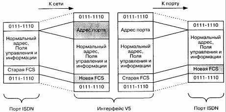 Кадр сигнализации ISDN, правильно принятый из пользовательского порта (исходный кадр), дополняется расположенным в начале кадра адресом порта, который передал этот кадр. Проверочная комбинация (FCS) в конце исходного кадра пересчитывается и подставляется вместо исходной. Затем модифицированный таким образом кадр проходит через интерфейс V5 к АТС (рис. 6.9). Правильно принятый модифицированный кадр, поступивший от станции через интерфейс V5, обрабатывается в обратном порядке: