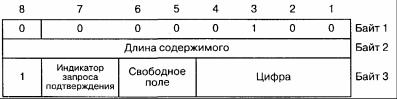 Длина информационного элемента «Цифра» всегда равна 3 байтам. В битах 1-4 передается в двоичном коде одна цифра номера, принятая сетью доступа от абонента, или цифра, которую АТС передает в сеть доступа. Нулевое значение всех битов 1-4 соответствует ошибке. Биты 5 и 6 третьего байта всегда имеют значение 0. Поле индикатора запроса подтверждения позволяет АТС запросить сеть доступа указать конец передачи цифры в порт пользователя. В направлении от сети доступа к АТС данный бит всегда имеет значение 0.