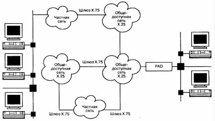 На рис. 9.4 показан пример взаимодействия сетей Х.25 с использованием межсетевых шлюзов Х.75 и устройств сборки-разборки