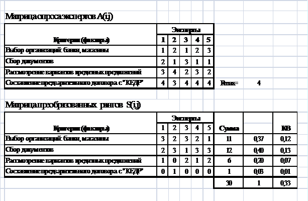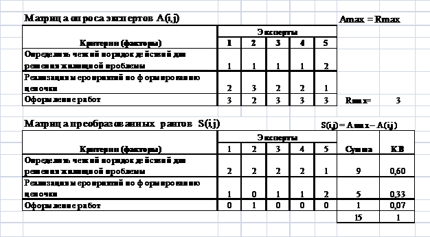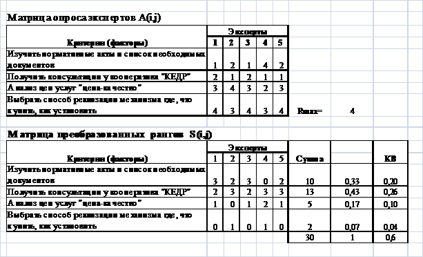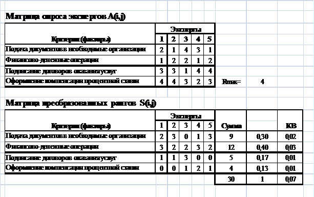 Для рационального использования информации, полученной от экспертов, необходимо преобразовать ее в форму, удобную для дальнейшего анализа. Метод ранжирования состоит в том, что эксперту предлагается присвоить числовые ранги каждому из приведенных в анкете факторов, т.е. эксперт должен расположить объекты (альтернативы) в порядке, который представляется ему наиболее рациональным, и приписать каждому из них числа натурального ряда - ранги. При этом ранг I получает наиболее предпочтительная альтернатива, а ранг N - наименее предпочтительная.
