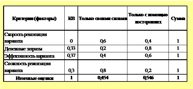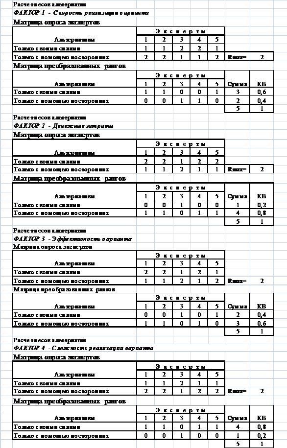- Выполнить расчёт коэффициентов весомости альтернативных вариантов решений для всех деревьев мероприятий (для одного дерева приведем полный расчет), при этом осуществляем: