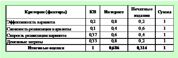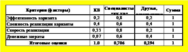 В своей работе я применял метод экспертных оценок для решения поставленной проблемы. Его сущность заключается в проведении экспертами интуитивно-логического анализа проблемы с количественной оценкой суждений и формальной обработкой результатов. Полученное обобщенное мнение экспертов принимается как решение проблемы.