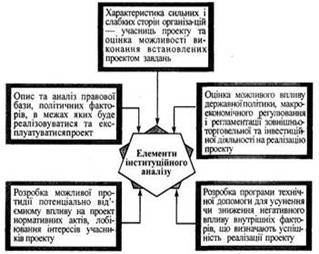 • виявлення й опис інституційних умов - організацій, законів, нормативних актів та політичних факторів, у рамках яких буде здійснюватися й експлуатуватися розглянутий проект. При цьому варто включити в аналіз усі організації (їх може бути декілька залежно від складності проекту), що беруть участь у проекті. Що стосується законів, політики, нормативних актів як об'єктів інституціонального аналізу, то розгляду підлягають лише найважливіші з них, здатні вплинути на проект;