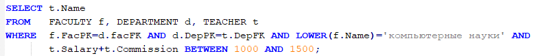 WHERE f.FacPK = d.FacFK AND d.DepPK = t.DepFK AND d.Name = 'Компютерні науки' AND t.Salary+t.Commission BETWEEN 1000 AND 1500