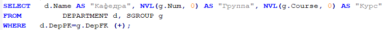 Вывести названия кафедр, номера и курс групп этих кафедр. Если на какой-то кафедре нет групп, то эта кафедра все равно выводится, а вместо номера группы и курса выводятся цифры 0. Причем, столбцы результирующей таблицы имеют следующие имена: