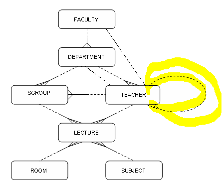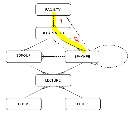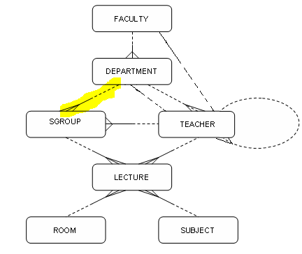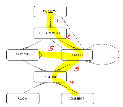 FROM FACULTY f, ROOM r, DEPARTMENT d, LECTURE l, TEACHER t