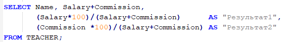SELECT Name, Salary+Commission, Salary/(Salary + Commission) AS "Результат1", Commission/(Salary + Commission) AS "Результат2"