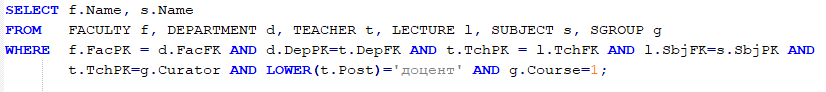 WHERE f.FacPK = d.FacFK AND d.DepPK = s.DepFK AND f.Name = 'Нафтогазової інженерії та комп`ютерних наук' AND s.Rating IN (12, 17, 25, 29, 33, 43, 50)