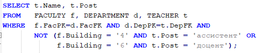 WHERE f.FacPK = d.FacFK AND d.DepPK = t.DepFK AND t.TchPK = l.TchFK AND r.RomPK = l.RomFK AND NOT t.Post = 'ассистент' AND r.Building = 4 OR r.Building = 6 AND t.Post = 'доцент'