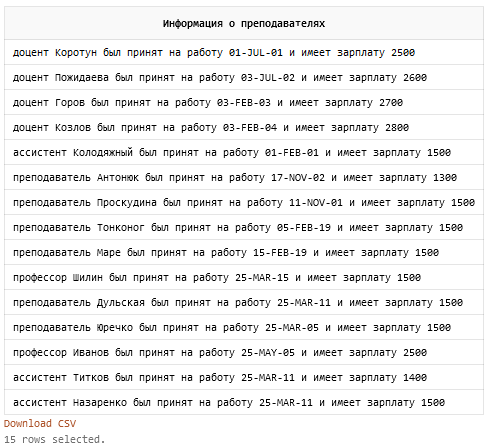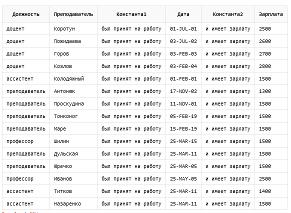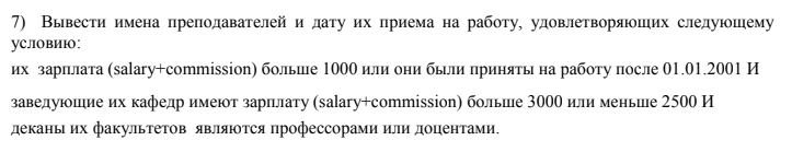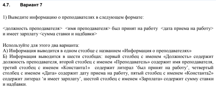 SELECT Post || ' ' || Name || ' был принят на работу ' || Hiredate || ' и имеет зарплату ' || (Salary+Commission) as "Информация о преподавателях"