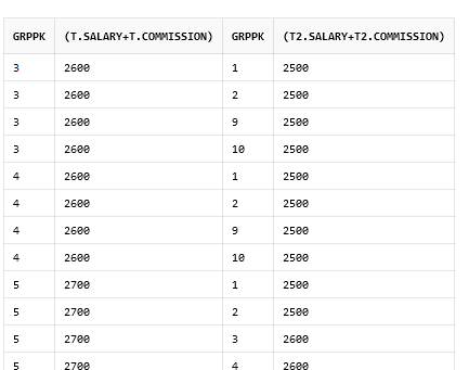 SELECT s.GrpPK, (t.Salary + t.Commission), s2.GrpPK, (t2.Salary + t2.Commission)