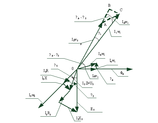 Электродвижущая сила Е2, наводимая во вторичной обмотке потоком Фо сердечника, получена в результате сложения вектора U2, с векторами I2R2 и I2X2 падений напряжения на активном R2 и реактивном Х2 сопротивлениях вторичной обмотки.
