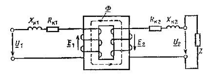 Здесь Rk1, Rk2 - активные сопротивления обмоток катушек; Xk1,Xk2 - индукционные сопротивления обмоток, обусловленные потоками рассеяния.