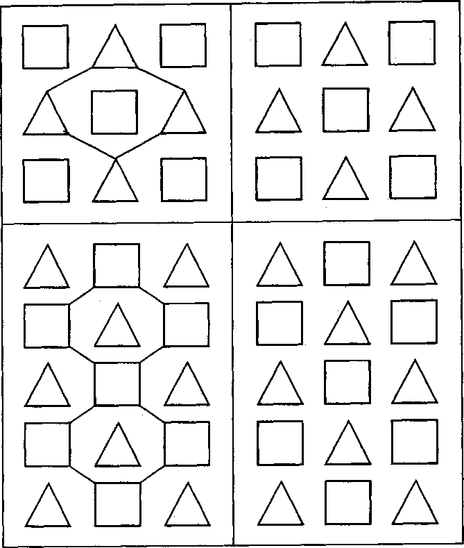 Детям показывают рис. 5, 6 и объясняют, что задание к этой методике заключается в том, чтобы с помощью карандаша или ручки как можно быстрее и как можно точнее воспроизвести на правой половине этого же рисунка тот контур, который представлен в его левой части. Все линии необходимо стараться делать прямыми и точно соединить углы фигур. Желательно также, чтобы контуры фигур были воспроизведены в тех же самых местах, где они изображены на рисунках — образцах в левой части. Оцениваться в итоге выполнения задания будут аккуратность, точность и скорость работы.
