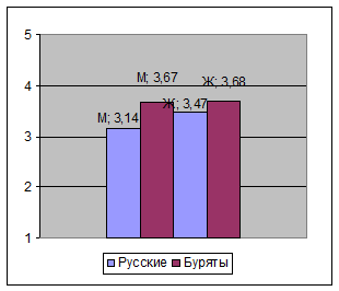 У бурятского этноса критерий саморазвития личности выше, чем у русского народа (рис.6). Это объяснятся, прежде всего, религией - буддизмом, в котором присутствует обозначение нацеленности на внутреннюю гармонию и спокойствие, нацеленность внутрь себя, самопознание через успокоение.
