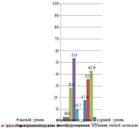 - количество учеников с ниже среднего уровнем учебной мотивации снизилось с 15 школьников (53,6 %) до 1 школьника (3,6 %);