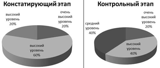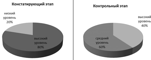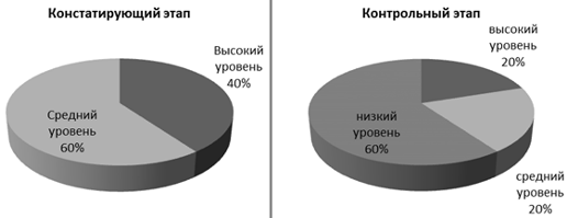 Т. о. на констатирующем этапе исследования уровень развития речи у экспериментальной группы был выявлен у 4 детей, что составило 80% от всех детей; низкий уровень - у 1 ребенка, что составило 20% от всех участников. На контрольном этапе высокий уровень развития был выявлен у 2 детей, что составило 40% от всех детей; средний уровень - у 3 детей, что составило 60% от всех участников.