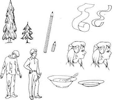 Посмотрите на рисунки и назовите слова, противоположные по смыслу. Скажите, чем отличаются похожие лица и предметы: высокая - низкая (елка - елочка); длинный - короткий (карандаш); широкая - узкая (лента); грустное - веселое (лицо девочки); глубокая - мелкая (тарелка); чистый - грязный (мальчик).