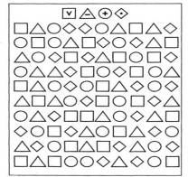 Перед началом выполнения задания ребенку показывают рисунок и объясняют, как с ним работать. Эта работа заключается в том, чтобы в каждом из квадратиков, треугольников, кружков и ромбиков проставить тот знак, который задан вверху на образце, т.е., соответственно, галочку, черту, плюс или точку.