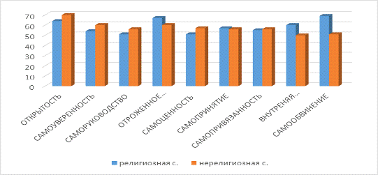 Низкие результаты по шкале «самоуверенность» набрали 15% испытуемых из нерелигиозных семей. Им свойственна чувство беспомощности, сомнение в возможности вызывать уважение к себе, часто неудовлетворенны собственными возможностями. Средний уровень «самоуверенности» является характерным для 60 % подростков из. Им свойственна уверенность в собственных силах с позитивным самooтношением. Высокие значения имеют 25 % подростков, это характеризует наличие у них уверенности и ощущения силы своего «Я».