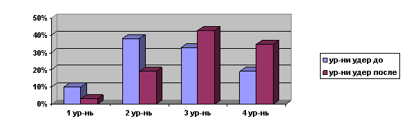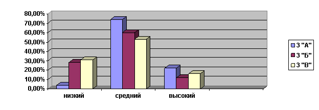 В 3 «Б» классе уже 12%, в отличие от 4% учащихся показали высокий уровень, 60%, в отличие от 40% учащихся показали средний уровень восприятия, лишь 28% по сравнению 56% учащихся показали низкий уровень восприятия после апробации программы психологического сопровождения.