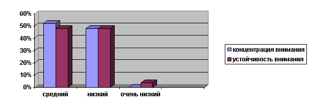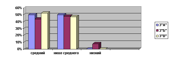 Высокий уровень внимания характеризуется высокой степенью интенсивности или сосредоточенности внимания ученика, в умении сосредотачиваться на одном и том же объекте, сознательным и осмысленным перемещением внимания с одного объекта на другой, способностью быстро ориентироваться в сложной изменяющейся ситуации, высоким качеством выполнения несколько видов деятельности одновременно. Но к сожалению, в опрашиваемых классах высокого уровня развития внимания не достиг ни один учащийся 3-го класса.