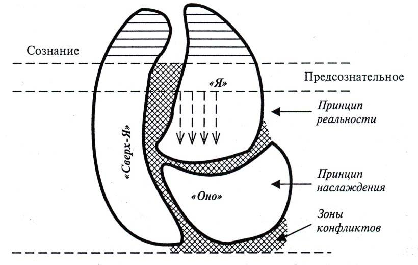 Система предсознательного «Я». Третьим пластом психической личности Фрейд называет предсознательное «Я». Оно находится между «Сверх-Я» и «Оно» (бессознательным), связывая их как посредник. И именно здесь психические переживания подвергаются как бы двойной цензуре. Рядом с принципом наслаждения начинает действовать новый принцип - принцип реальности. Он оценивает уместность и возможность выполнения того или иного действия, мотивируемого потребностями «Оно». Пройдя цензуру, которая лежит на границе бессознательного и «Сверх-Я», психические элементы получают вербальное (словесное) оформление и только после этого могут перейти в сознание. Не прошедшие испытание «принципом реальности» психические элементы (например, асоциальные, эгоистические потребности, агрессивные, сексуальные влечения) вытесняются вновь в систему бессознательного. Таким образом, все, что находится в сознании или может войти в него, строго профильтровано.