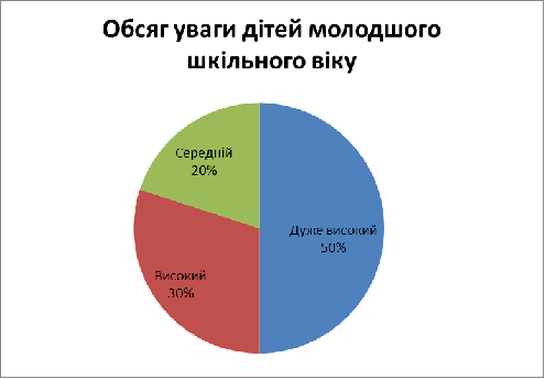 Максимальний рівень обсягу уваги набрало 50% дітей. Їх показник оцінено у 10 балів, що відповідає дуже високому рівню розвитку обсягу уваги. Таких дітей виявилося найбільше. Високий рівень обсягу уваги набрало - 30% дітей. Середній рівень обсягу уваги набрало - 20% дітей.