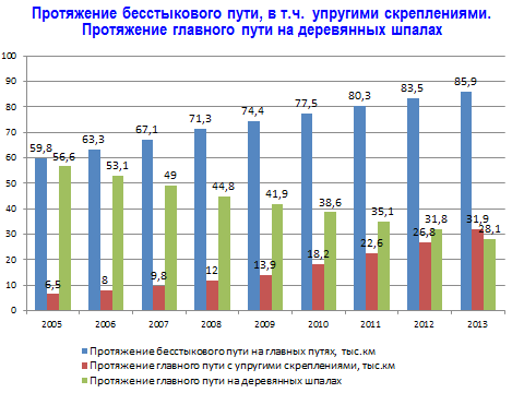 Рисунок 1. Протяженность бесстыкового пути и главного пути с упругими скреплениями