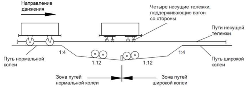 Для перестановки вагонов на тележки другой колеи оборудуются специальные пункты перестановки вагонов, они могут быть:
