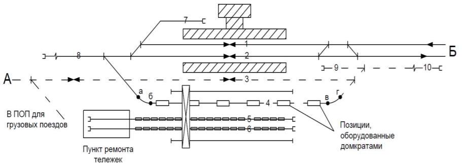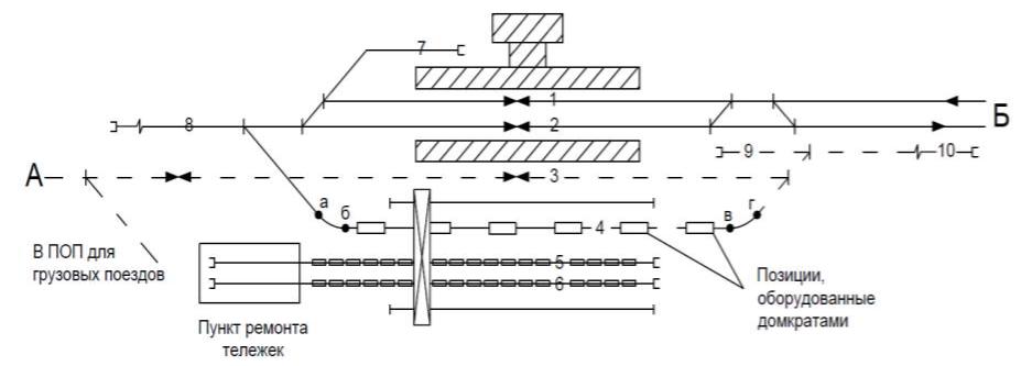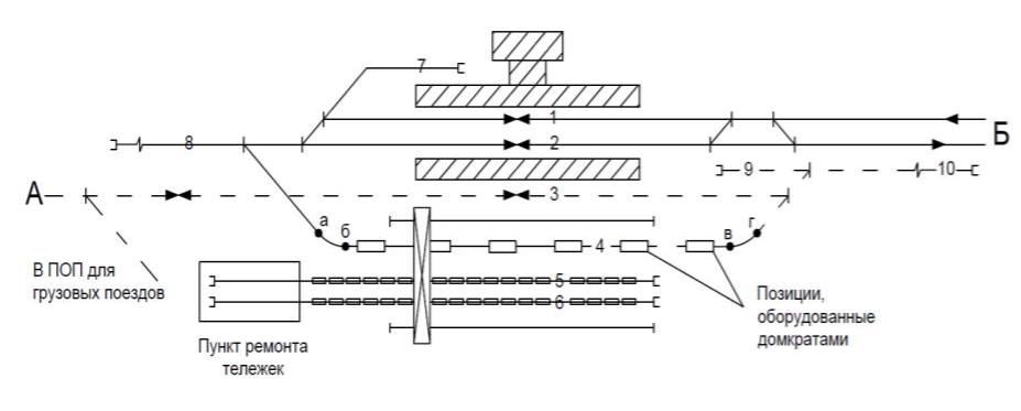 Остальные вагоны, у которых необходимо сменить тележки, подают со стороны А через вытяжной путь 8 на путь 4, который на участке а-б сужается с 1520 мм до 1508 мм, а на участке в-г – с 1508 мм до 1435 мм.
