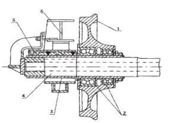Колесная пара конструкции Н. Гайдарова: 1 - колесо; 2- подшипники качения; 3 - гильза; 4 - ось; 5 – зубчатый механизм: 6 - рама тележки