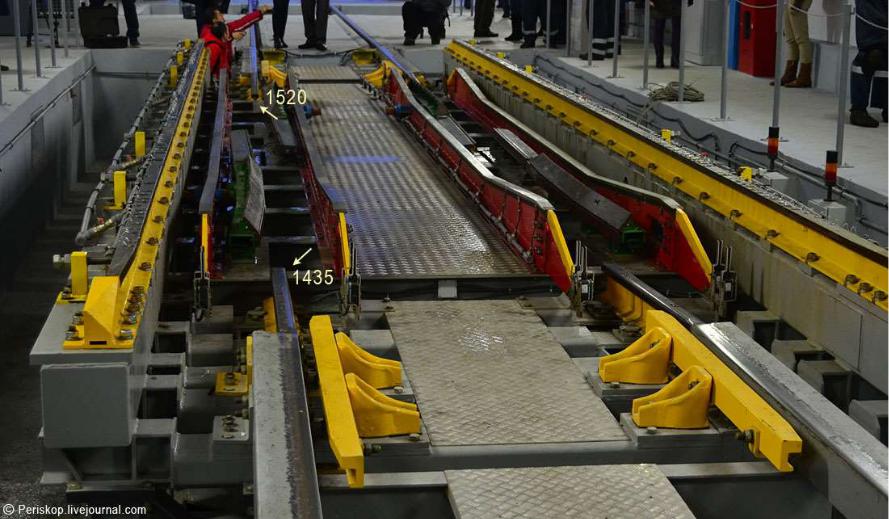 Поэтому на средней части оси колесных пар размещаются тормозные диски. Такое решение тормозной системы значительно упрощает систему перехода вагонов с одной колеи на другую.