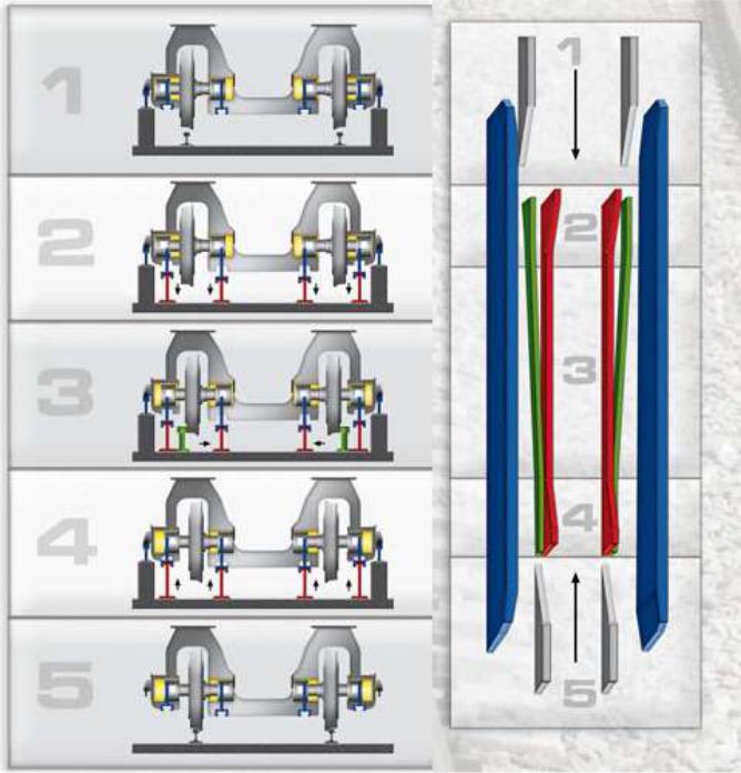 Испанская фирма Talgo, принимая во внимание потребности развития пассажирских перевозок между Испанией (ширина колеи 1668 мм) и Францией (ширина колеи 1435 мм), в 1965 г. начала разработку новой системы автоматической перестановки колес на другую колею. Перестановка осуществлялась при следовании вагона со скоростью (до 15 км/час) по специальной стационарной установке. Практическое применение РКП началось в 1969 г., после прибытия пассажирского поезда Talgo RD из Барселоны в Женеву.
