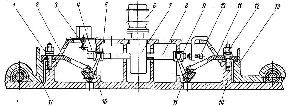 Червячный редуктор 7 передаёт вращение плавающему шлицевому валику 8. Валик по резьбе сопрягается с подвижной гайкой 5. С другой стороны на валике зафиксирована неподвижная гайка 9. Эти гайки в свою очередь сопряжены с эксцентриковыми рычагами 15 и 16, благодаря имеющимся у них пазам по бокам. Также в соединение с этими рычагами входят зажимные рычаги 2 и 11. С другой стороны они упираются в направляющие стойки 13 и 17. На траверсе зажимные рычаги зафиксированы гайкой 12 и шпилькой 1. Когда вращение передаётся от редуктора к валику 8, происходит сближение гаек 5 и 9, а рычаги 15 и 16 в свою очередь поворачиваются к середине траверсы и приподнимают рычаги 2 и 11 с помощью роликов. Таким образом происходит зажим траверсу 14 рычагами 2 и 11 к направляющим стойкам. После закрепления траверсы электродвигатель автоматически отключается благодаря реле максимального тока.
