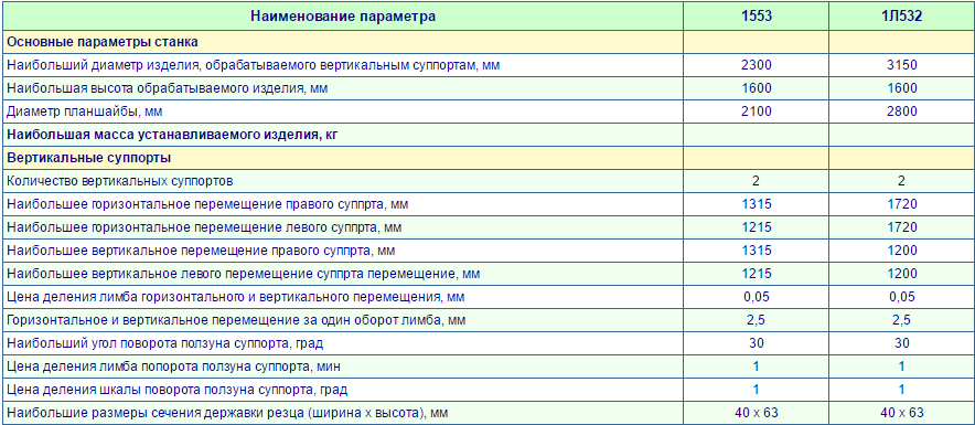 Токарно-карусельный двухстоечный станок 1553 предназначен для токарной обработки заготовок различных деталей из черных и цветных металлов в условиях единичного, мелкосерийного и серийного производства. На станке можно производить обтачивание и растачивание цилиндрических и конических поверхностей, протачивание и подрезка торцовых поверхностей, прорезание кольцевых канавок, сверление отверстий, зенкерование и развертывание центральных отверстий в крупногабаритных деталях класса дисков и втулок, высота которых не превышает 1,5—2 диаметров. Протачивание торцовых поверхностей можно производить с постоянной скоростью резания.