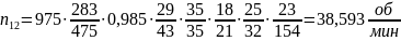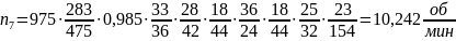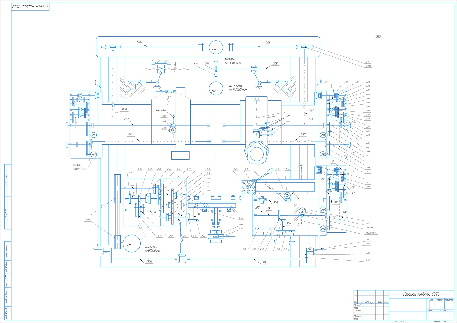 Главное движение – вращение планшайбы с заготовкой. Планшайба станка приводится в движение электродвигателем через клиноременную передачу 283—475, коробку скоростей, переборное устройство, коническую передачу 25—32, вал VII и колеса 23—154. В коробке скоростей находятся тройной и двойной передвижные блоки шестерен Б1 и Б2, обеспечивающие валу III шесть скоростей вращения. От вала III вращение передается валу VI либо непосредственно колесами 18—21, либо через двухступенчатый перебор. В последнем случае вал VI получает вращение от вала III через колеса 18—44, вал IV. двойной подвижный блок Б3, вал V и шестерни 18—44.
