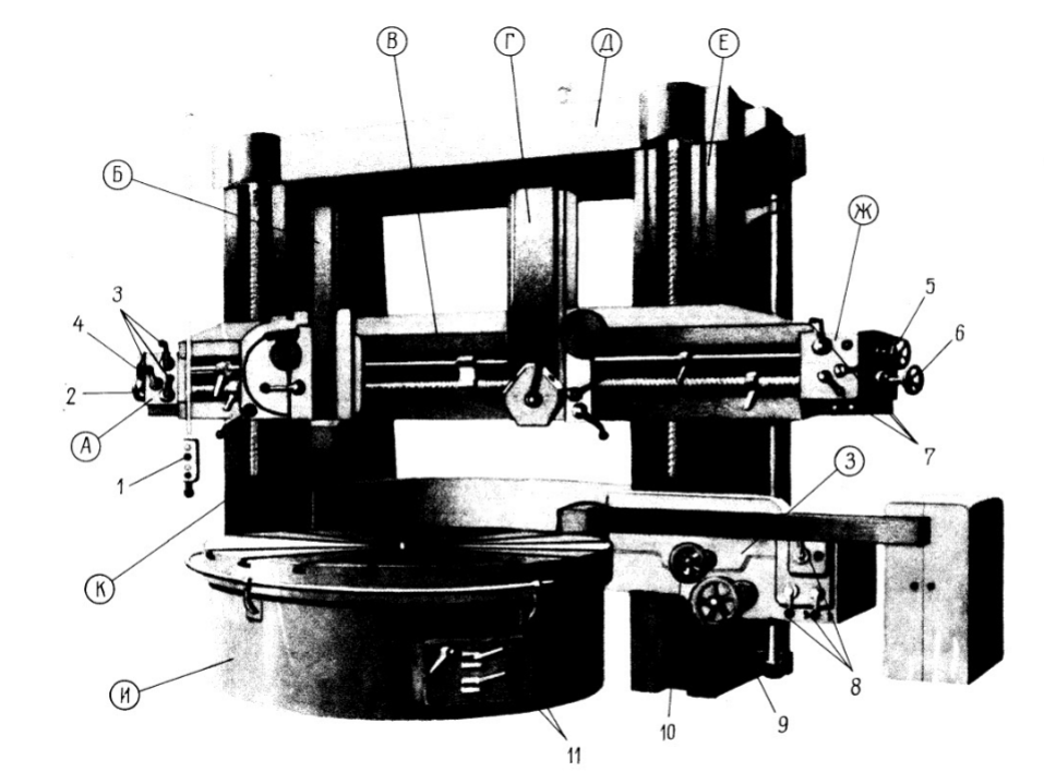 Обрабатываемая деталь закрепляется на планшайбе, которой сообщается вращательное движение в горизонтальной плоскости. Режущие инструменты закрепляются в боковом и верхних суппортах. Боковой суппорт З - служит в основном для обточки наружных поверхностей, выточки канавок и подрезки торцов; в его четырехпозиционной головке закрепляются резцы различных типов. Верхний поворотный суппорт Б используется для обработки наружных и внутренних конических поверхностей. Верхний суппорт Г имеет пятипозиционную револьверную головку, в которой закрепляются инструменты, предназначенные главным образом для обработки отверстий.