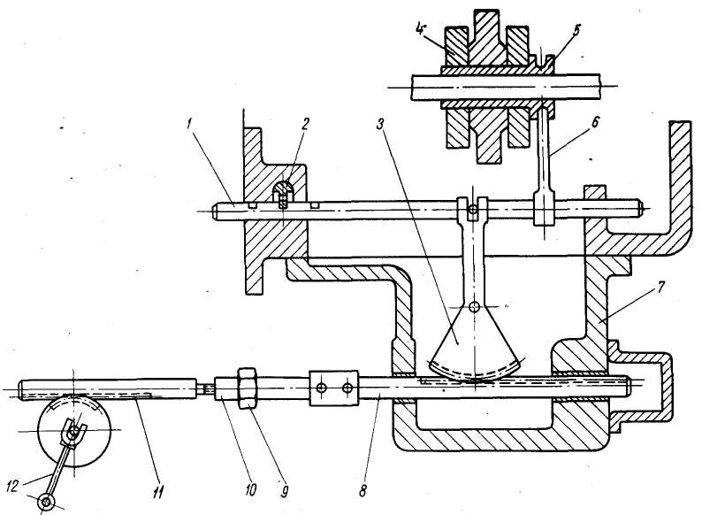 При вращении червяка 1 косозубое колесо 6 перемещается по резьбе винта 7 и тем самым приподнимает шпиндель планшайбы либо опускает его, в зависимости от того, в какую сторону вращается червяк.