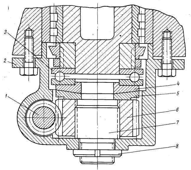 В верхнее кольцо шарикового упорного подшипника 3 упирается шпиндель планшайбы. На сферических шайбах 4 и 5 установлено нижнее кольцо подшипника. Шайба 5 поджимается торцом косозубого колеса 6, который навинчен на резьбу винта 7. Винт закреплен в корпусе 2 гайкой 8. Для регулировки подпятника в корпусе предусмотрен червяк 1.