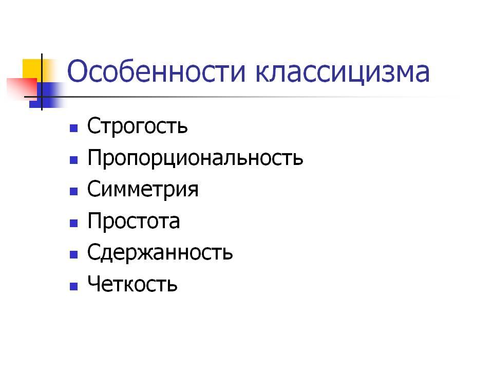 В основе классицизма лежат идеи рационализма, нашедшие яркое выражение в философии Декарта. Художественное произведение, с точки зрения классицизма, должно строиться на основании строгих канонов, тем самым обнаруживая стройность и логичность самого мироздания. Интерес для классицизма представляет только вечное, неизменное — в каждом явлении он стремится распознать только существенные, типологические черты, отбрасывая случайные индивидуальные признаки. Эстетика классицизма придаёт огромное значение общественно-воспитательной функции искусства. Классицизм устанавливает строгую иерархию жанров, которые делятся на высокие (ода, трагедия, эпопея) и низкие (комедия, сатира, басня). Каждый жанр имеет строго определённые признаки, смешивание которых не допускается.
